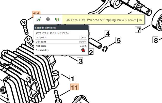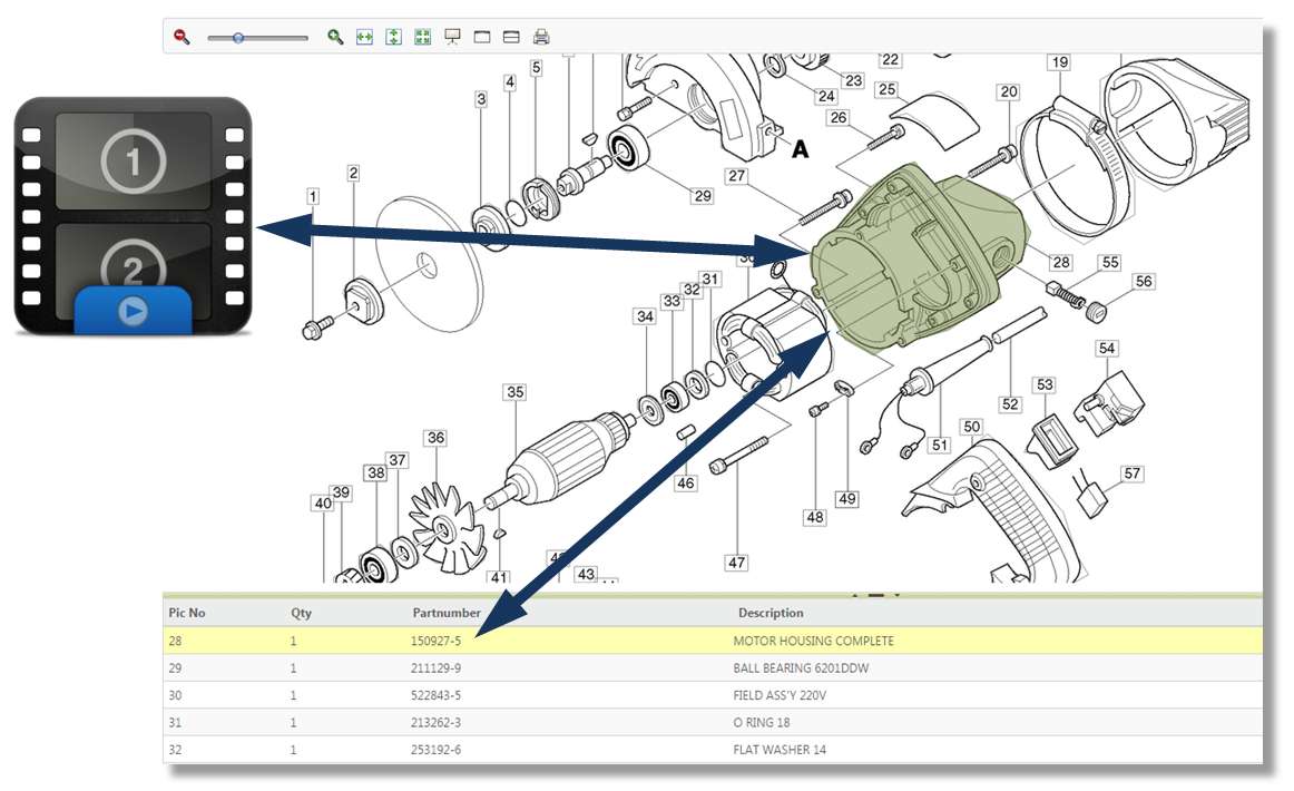 The highlighted component in the adjacent image is dynamically linked to its relative parts number, but also to a video, showing, for example, how it should be correctly installed and maintained.
