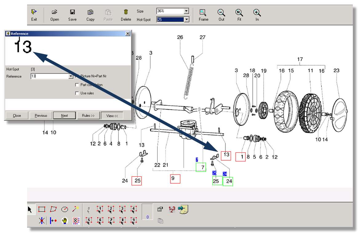 If vector images are used (such as those created by CAD systems) Hot Spot Editor will recognise the reference numbers as characters, create hot spots around them and link them to the relative parts list automatically, saving valuable time.