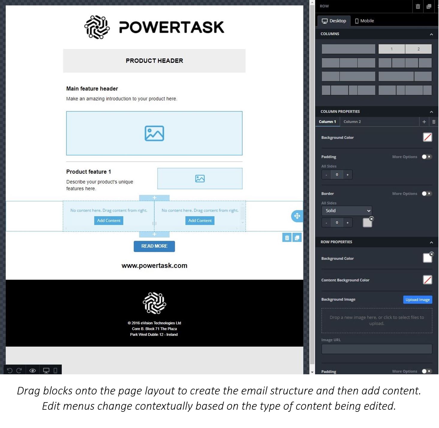 Content blocks may be dragged onto the workspace to define the email’s layout: single column, double column, etc. Blocks may then be filled with content, such as logos, headers, text, images, action buttons, links and more. Blocks and content are easy to move around, modify and format. They may also be customised to add columns, change background colours or simply to add space between adjacent blocks. The toolbar menu changes contextually according to the type of content being edited.