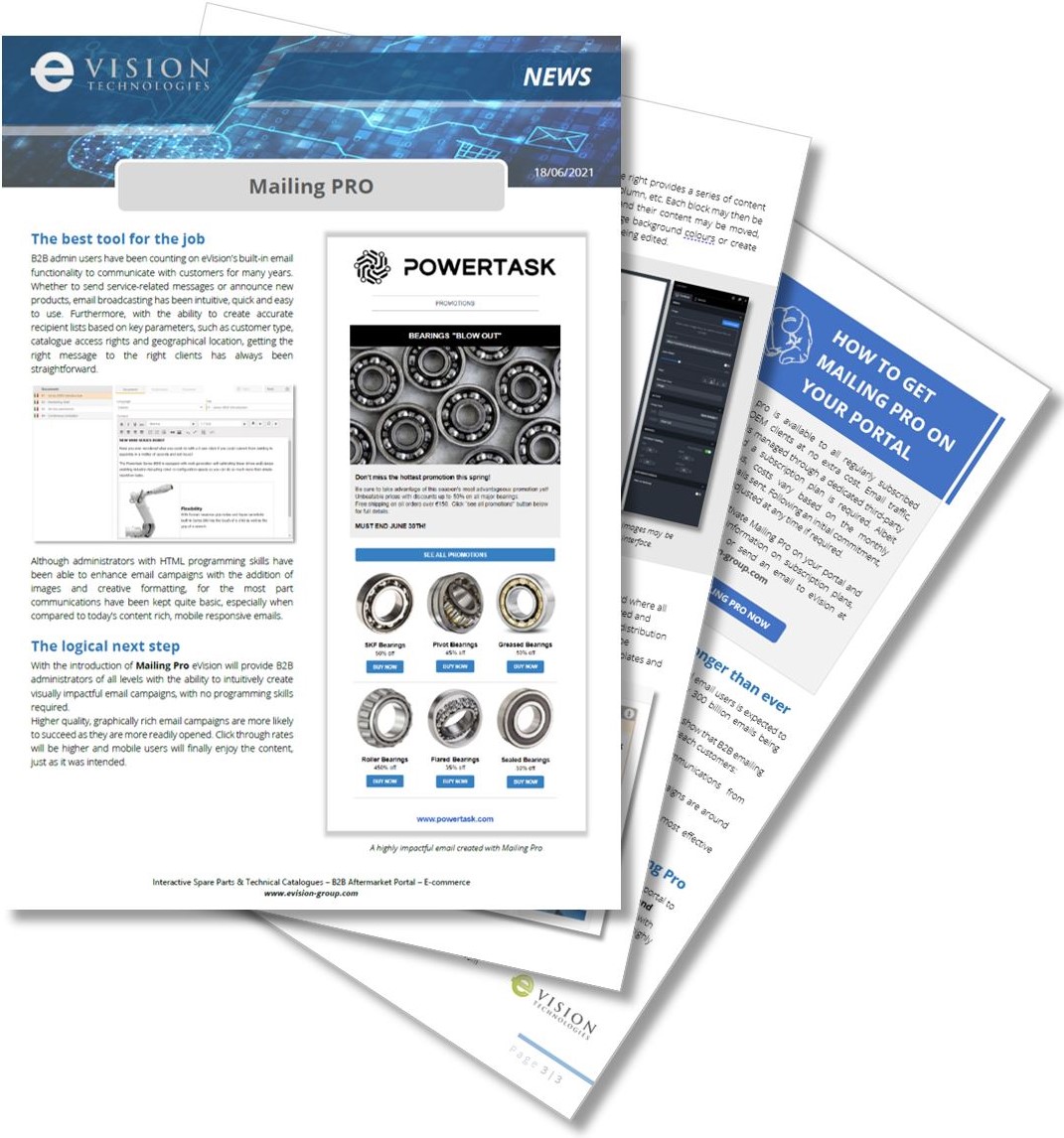 Mailing Pro takes email marketing on the eVision B2B portal to an entirely new level. Never before have spare parts and service teams been provided with such a valuable tool to reach their customers.