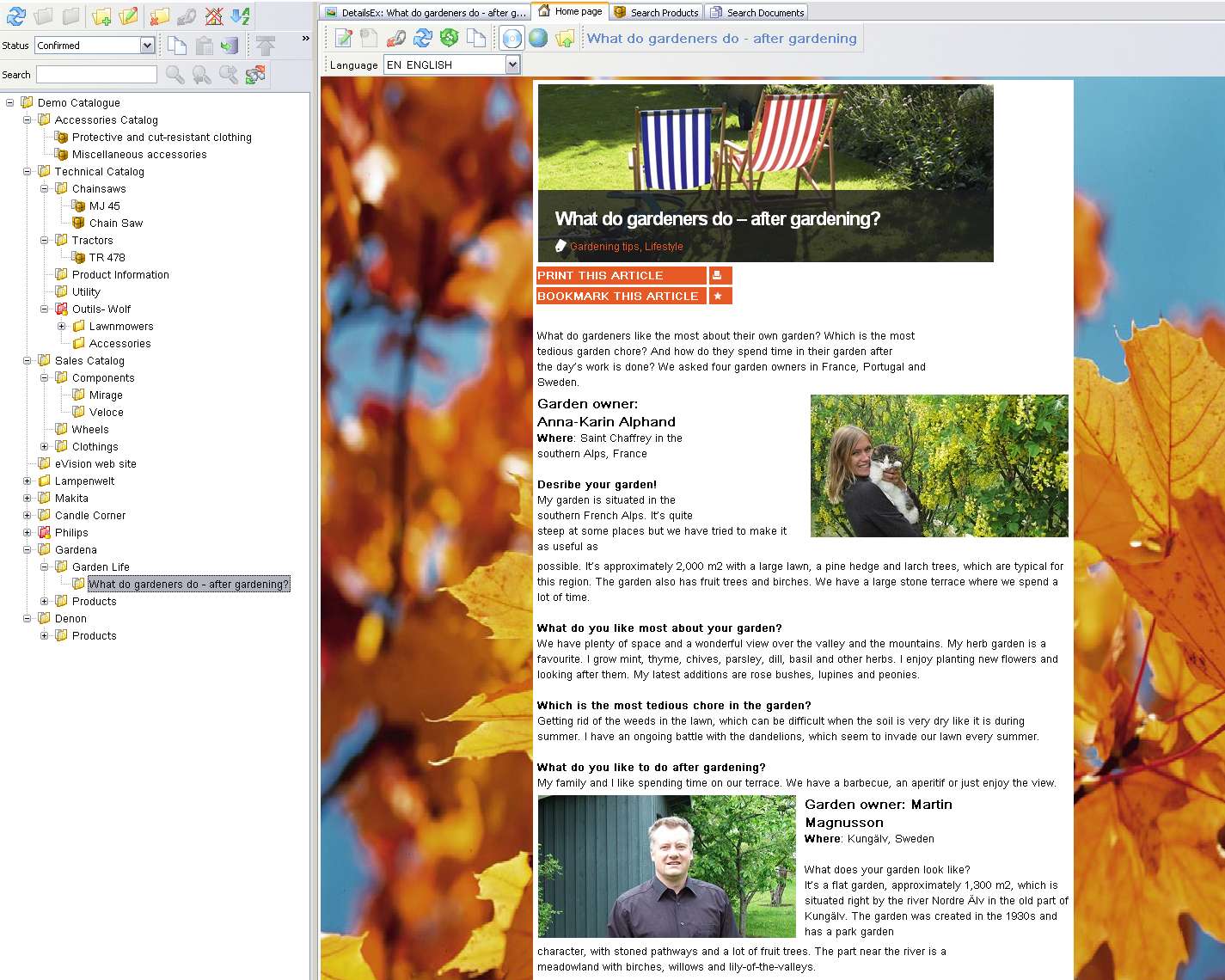 The directory in the left column displays a product-range being edited in Structure Manager, with categories, sub-categories and final products arranged as a logical hierarchy.